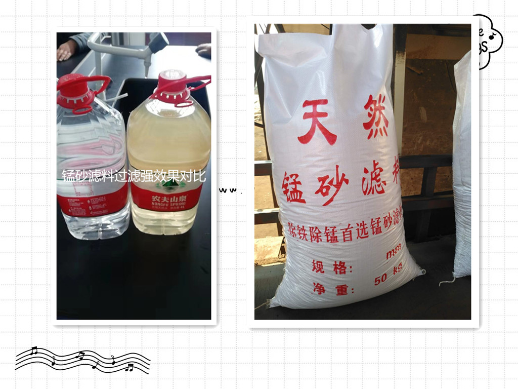 饮用水去黄用食品级天然锰砂滤料厂家直销,地下水,地表水铁、锰含量超标后水质颜色即发生变化,会给生活、生产用水将会造成很大的影响。睿鹏净水技术部经反复试验发现天然锰砂滤料锰砂中的MnO2与水中的Fe2+发生氧化还原反应,使Fe2+变为Fe3+并生成 Fe(OH)3沉淀,利用锰砂过滤器的反冲洗功能达到去除净化的目的。经广大新老客户长期使用效果显著。