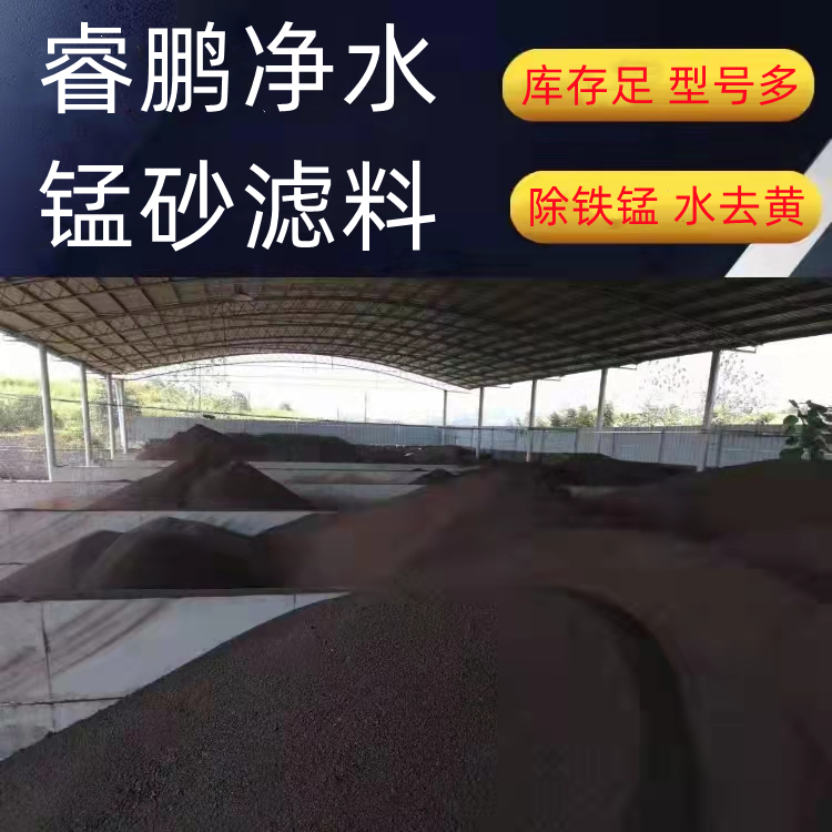 睿鹏净水锰砂滤料是一款高活性的氧化剂,MnO2+Fe+氧化生成Fe(OH)3沉淀,经设备反洗达到除铁,除锰,除砷,水去黄的效果。