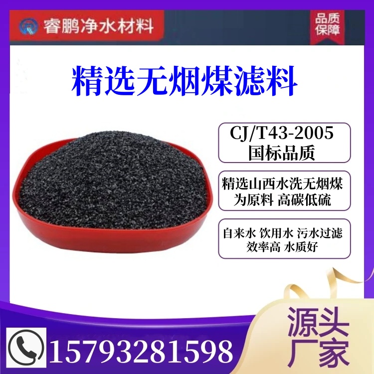 产品简介:睿鹏净水精制无烟煤滤料采用山西优质无烟煤为原料,经精选、破碎、和两次筛分而成,外观:呈黑色颗粒状,光泽度好。具有机械强度高,抗压性能好,化学性能稳定等特点。不含有毒物质,耐磨损,在酸性、中性、碱性水中均不溶解,另外无烟煤颗粒表面粗糙,有良好的吸附能力,孔隙率大(>50%),有较高的载污能力,因质轻,所需反冲洗强度较低,可节省大量反冲洗水量及电能。